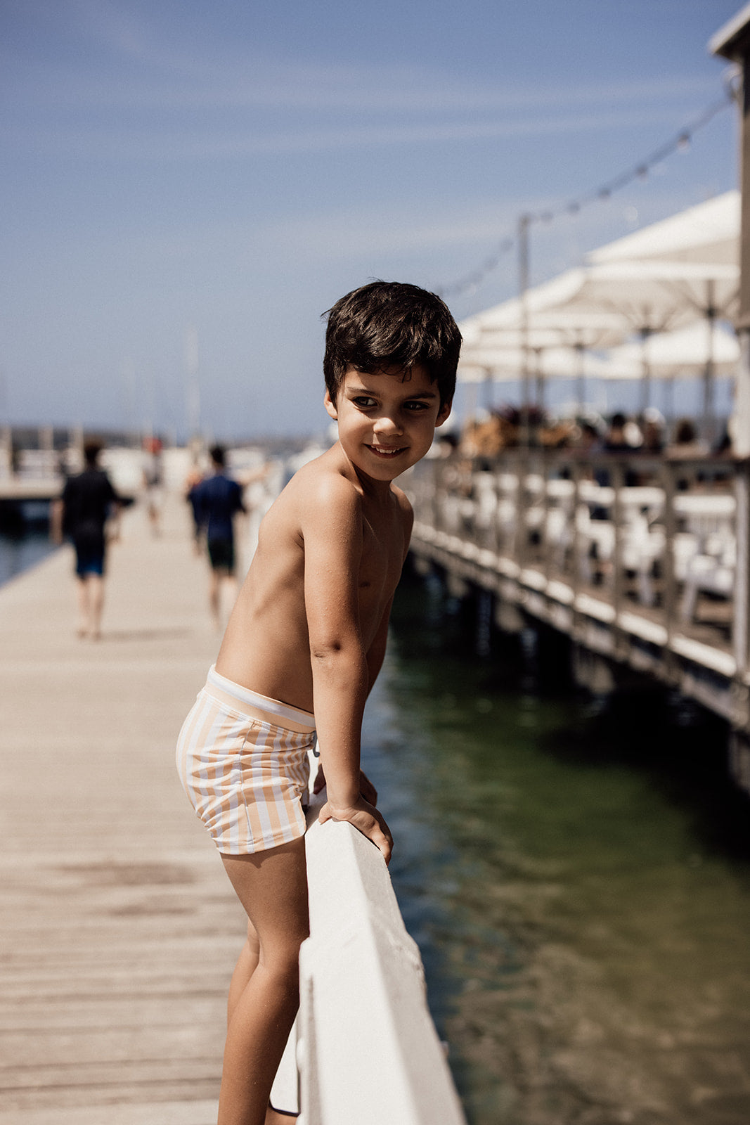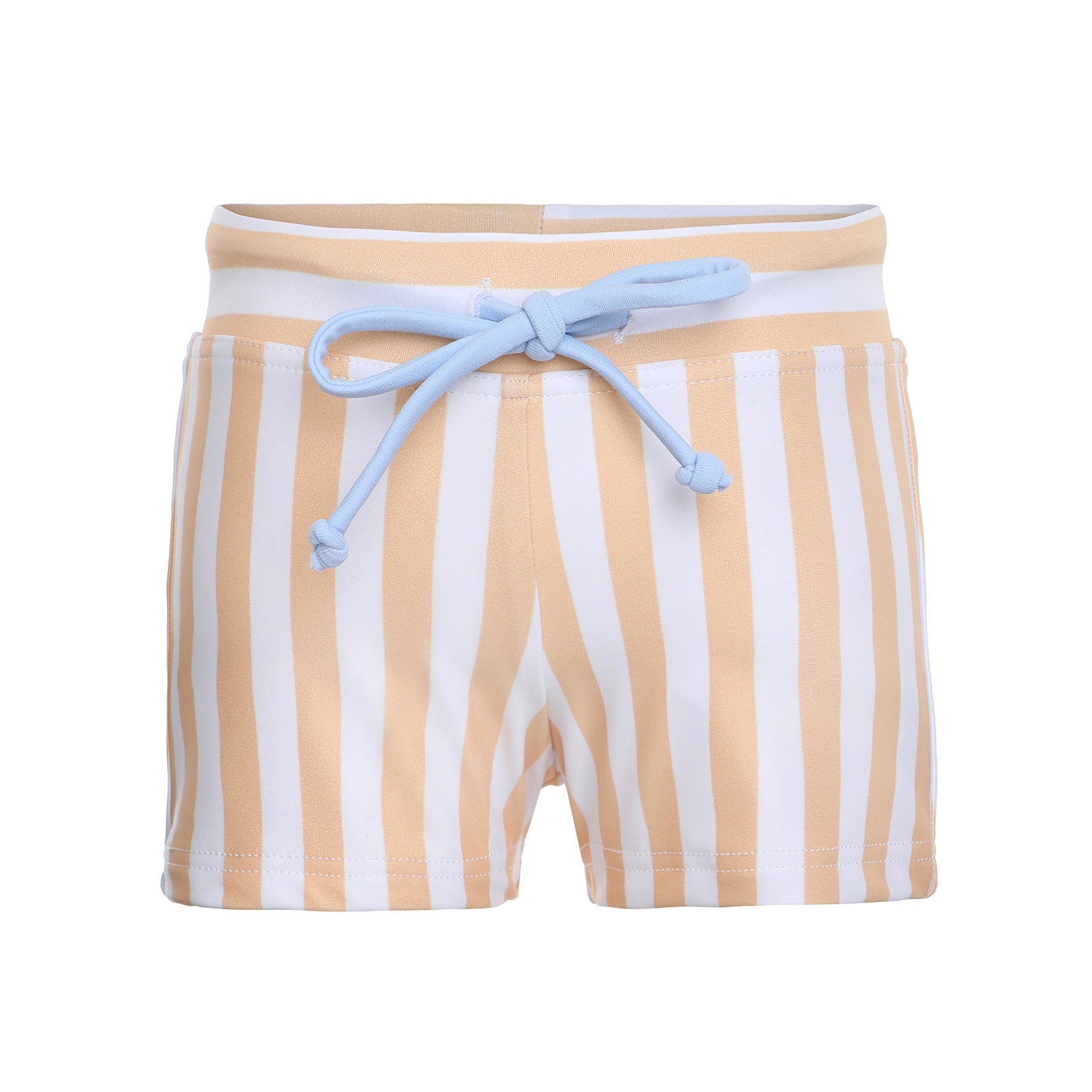 Perfect for long days spent at the beach or lounging poolside, these super cute euro shorts with contrast drawstring and elastic waist are fully lined and are made in UPF 50+ sun-protective and sustainable, high quality nylon/lycra fabric to keep him safe all day long.